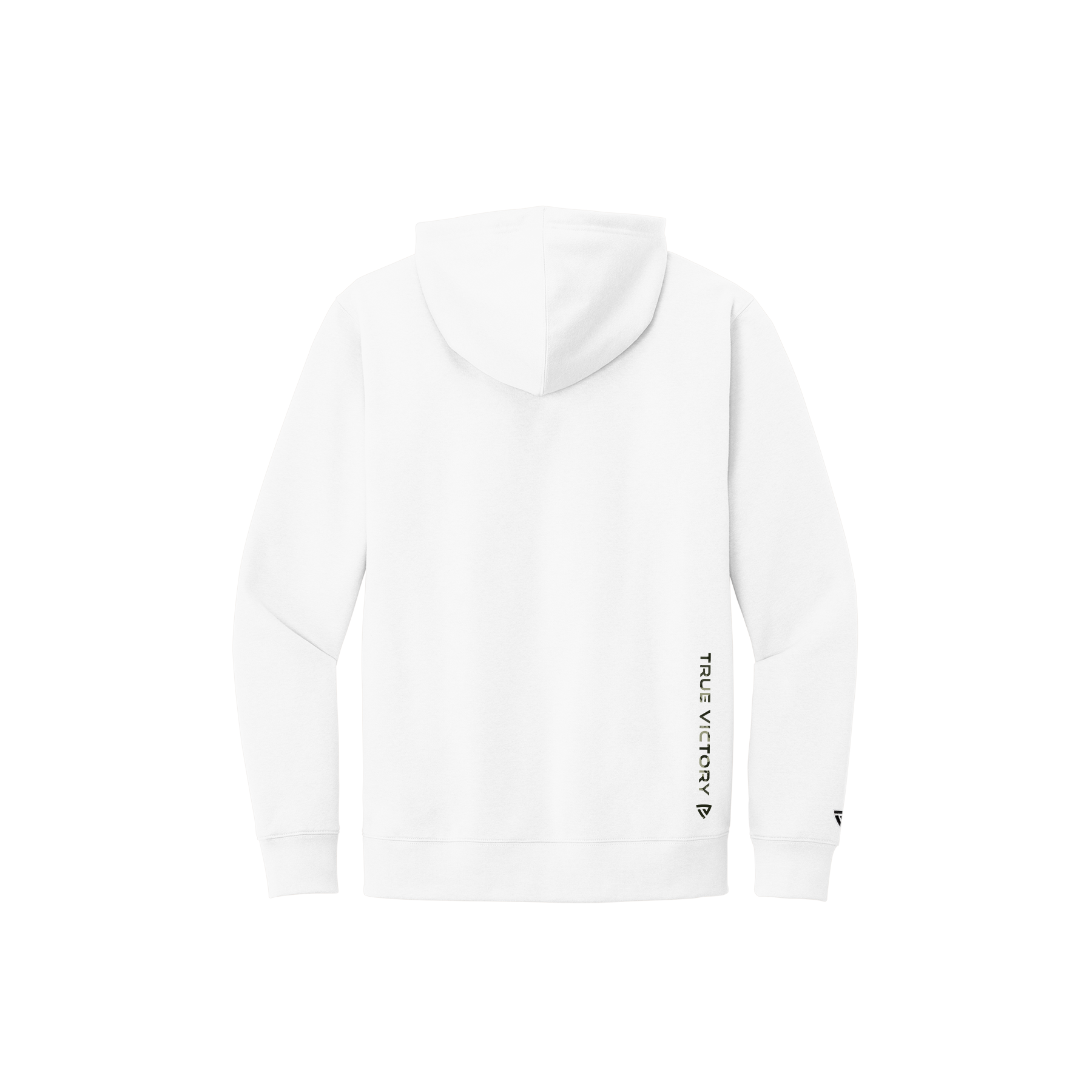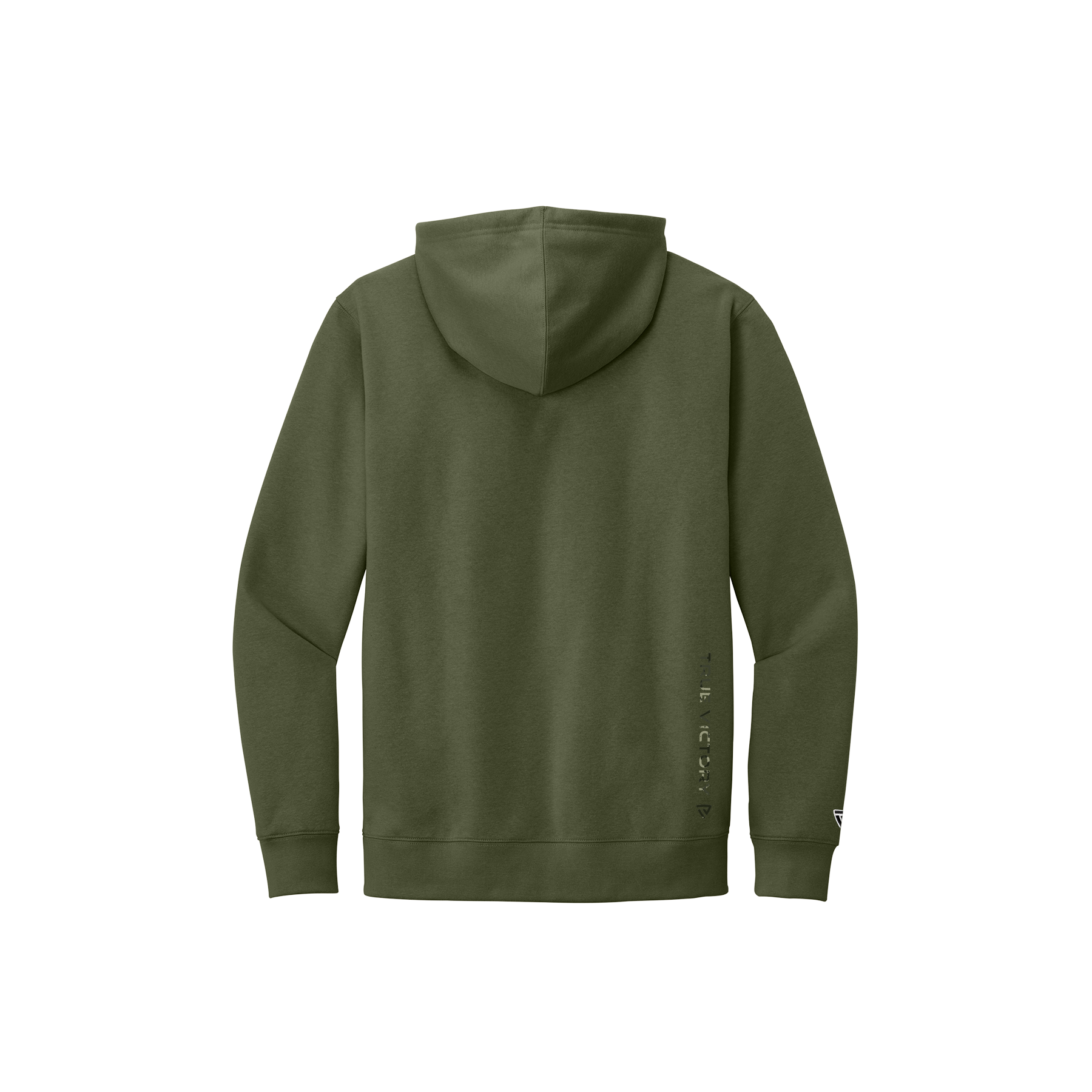 The front features an oversized True Victory shield in a rugged woodland camo pattern, symbolizing strength, grit, and resilience. A vertical True Victory wordmark is placed on the lower back hem for a clean, modern finish. The hoodie includes a jersey-lined two-piece hood, dyed-to-match drawcords, and aluminum grommets—bringing together toughness and style in every detail.