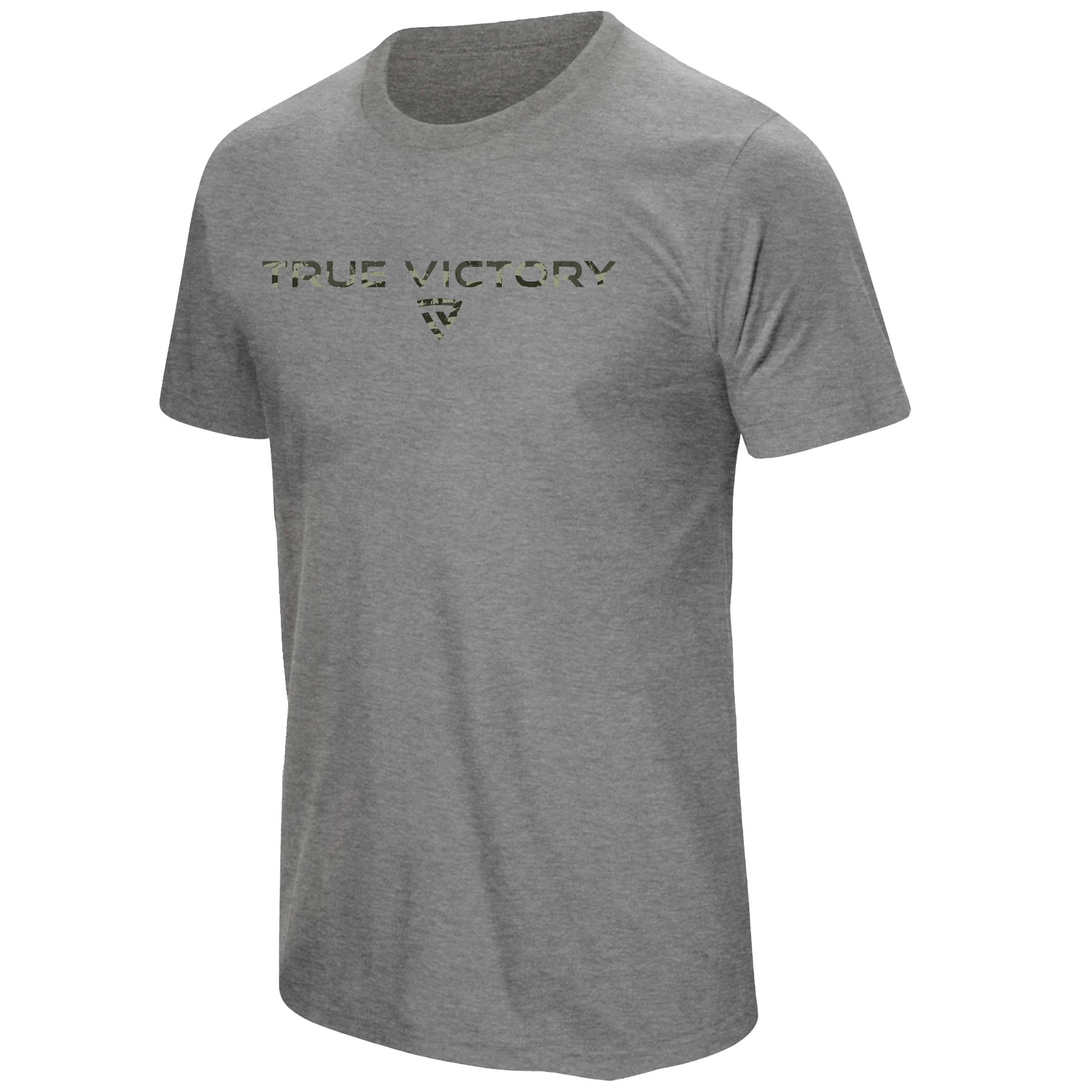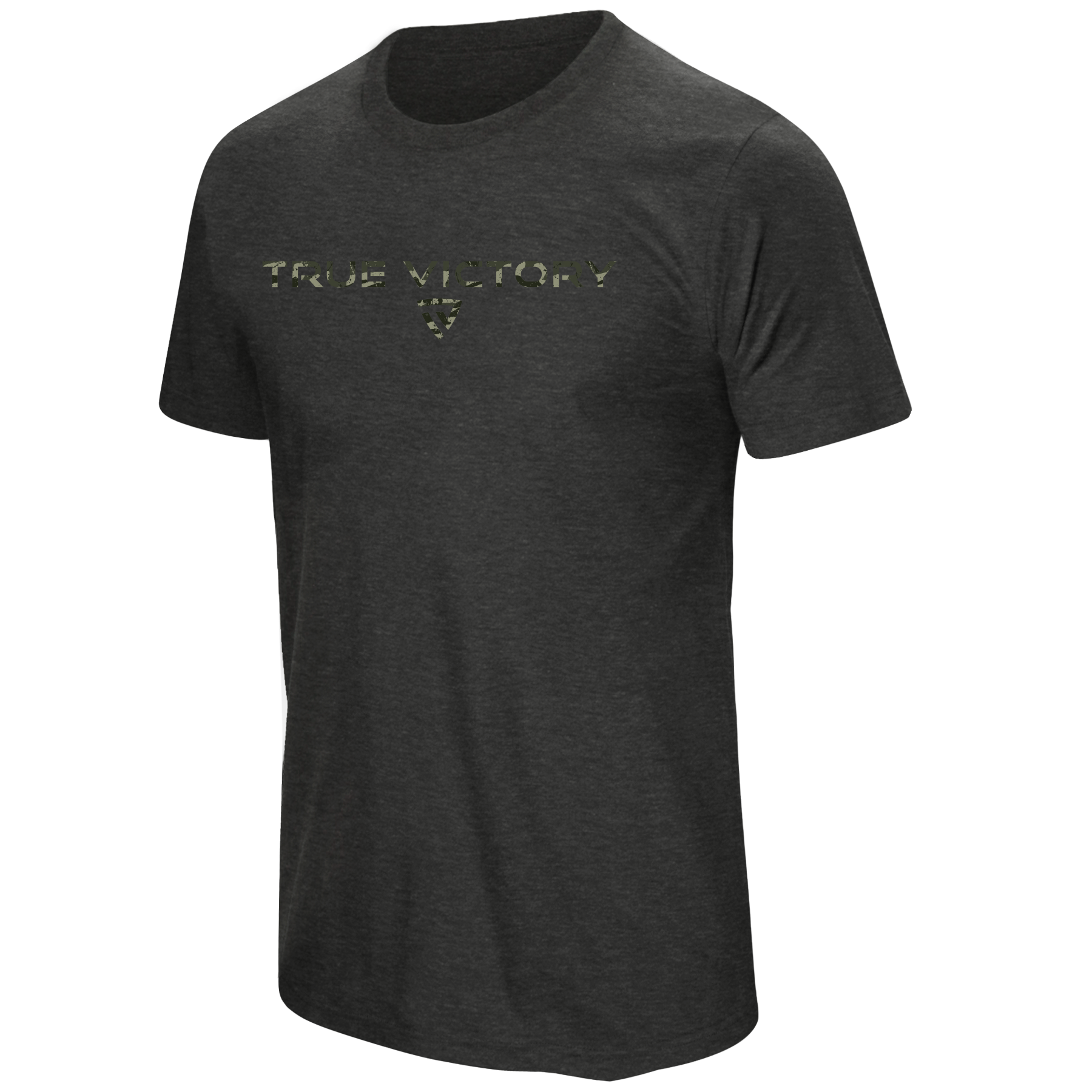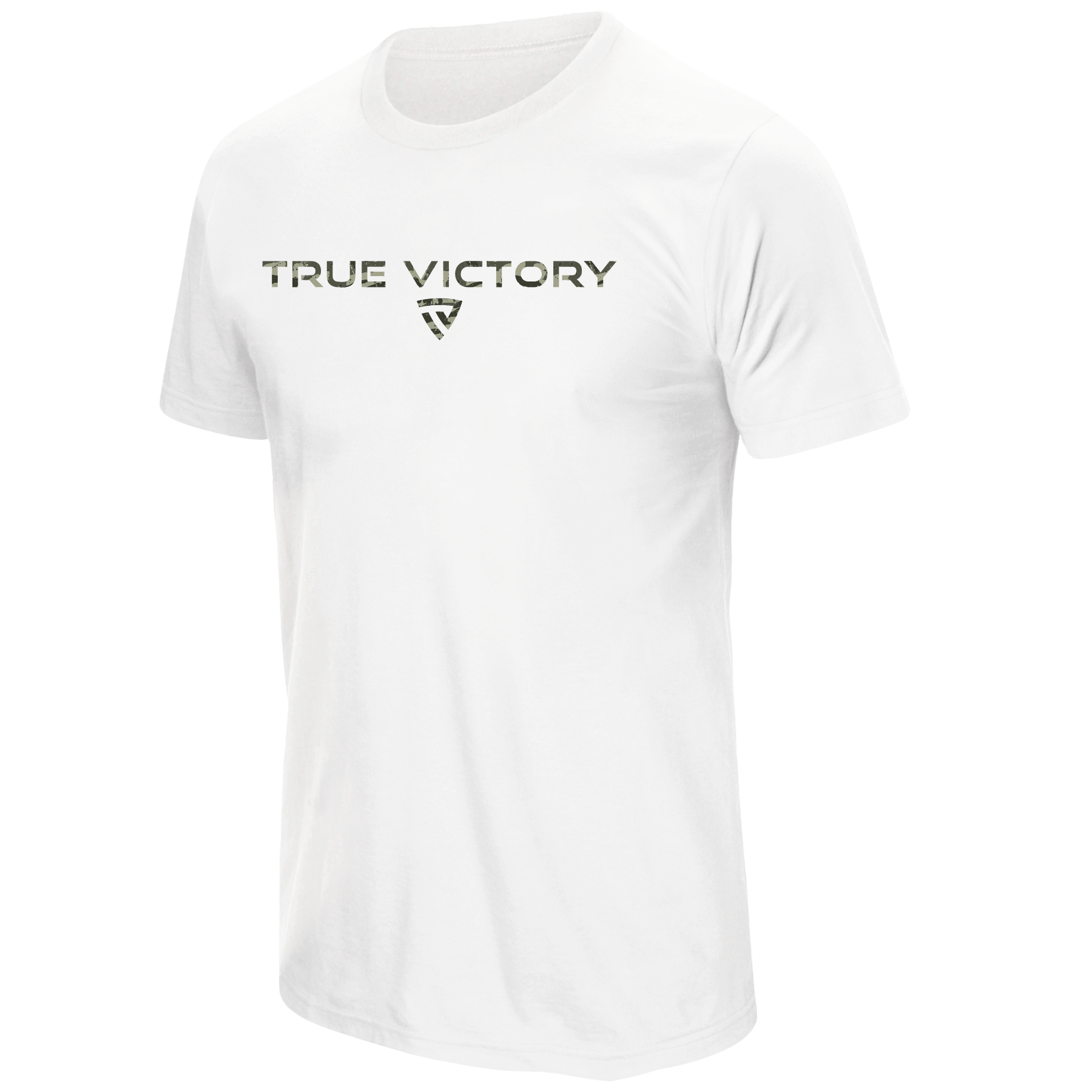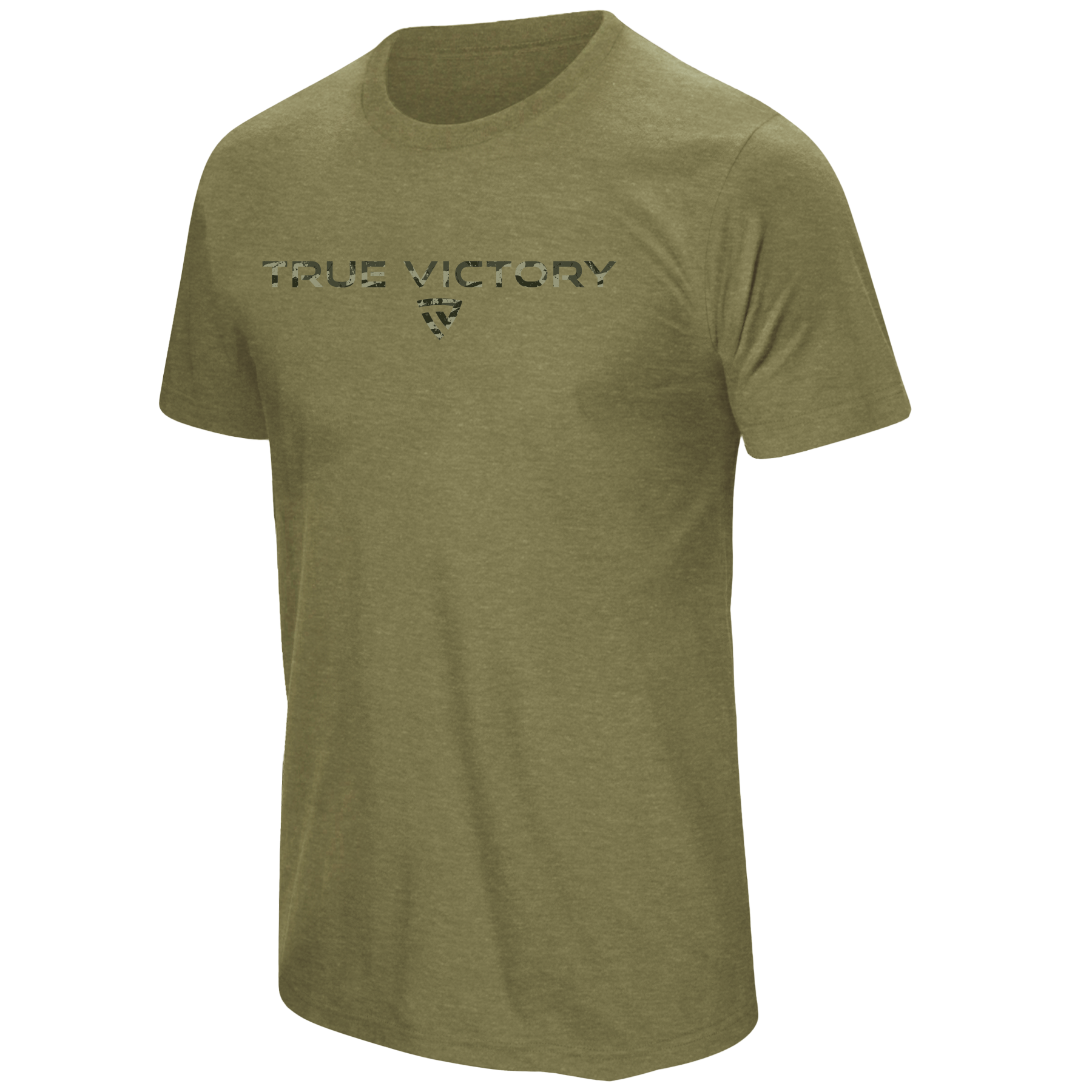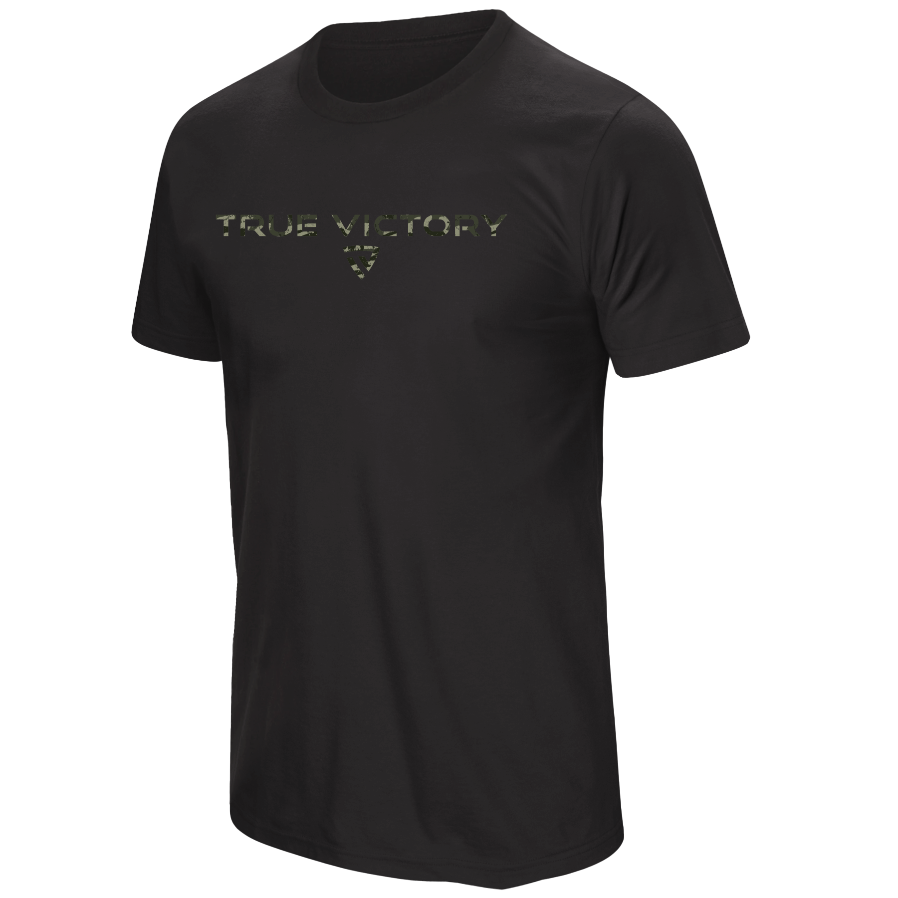 The front proudly displays the TRUE VICTORY wordmark in a rugged woodland camo pattern, paired with the signature shield emblem for a clean, disciplined look. Slightly heathered fabric elevates the style while keeping things lightweight and breathable.